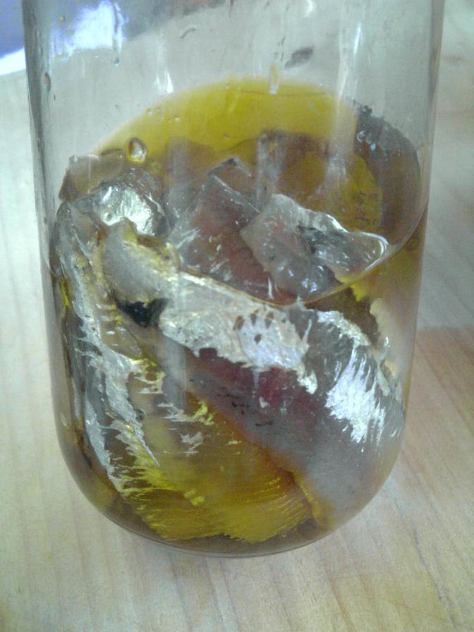 よい感じに漬かって(塩)きたので、処理をした後にオリーブオイルに漬けてみた。
