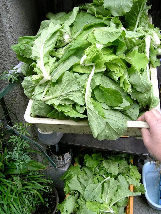 この間引きした菜っ葉、、、泥を噛んでるから下処理も大変。